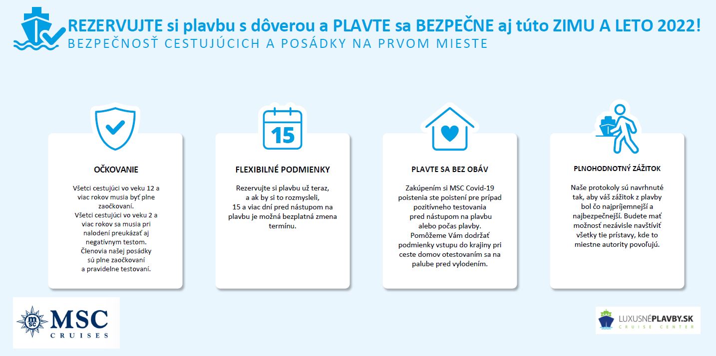 Tento program posilnený produktom Poistenie MSC Covid-19, poskytuje hosťom extra záruky pred a počas plavby. Konečne sme tiež svedkami návratu plnohodnotného zážitku z pobytu na pevnine s opätovným zavedením nezávislých pobrežných exkurzií tam, kde to miestne predpisy dovoľujú – skutočne je to najlepší čas na rezerváciu plavby.“