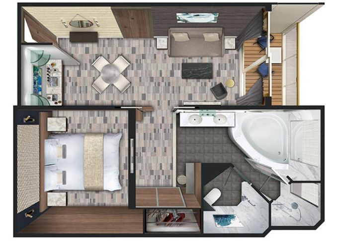 | SB - Aft-facing Owners Suite 56 m² / balkón 6 m². Vírivka. 9. paluba - vzadu. Max 2 osoby. Výhody Suite. | 27 814 € 13 907 € za osobu |