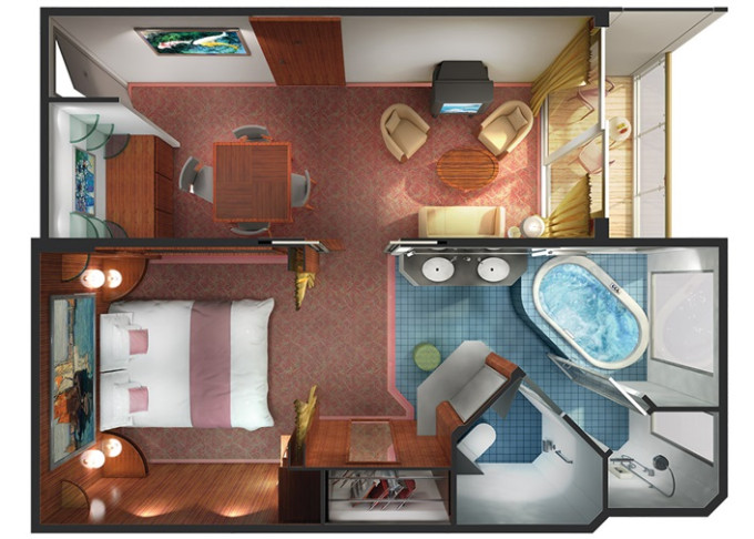 | SC - Forward-facing Deluxe Penthouse Suite 51 m² / balkón 10 m². Vírivka. 10. paluba - vpredu. Max 3 osoby. Výhody Suite. | 20 558 € 10 279 € za osobu |