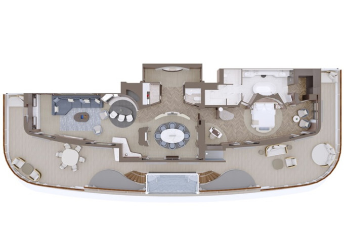 Ocean Residence - Retreat Residence Suita 63 m² + Terasa s vírivkou a sedením 14 m² / 7. paluba: 18 m². Spálňa s obývacou a jedálenskou časťou, šatník. Koktailová súprava, minibar, kávovar, vodná kanvica, ďalekohľad, sejf, mramorová kúpeľňa s vaňou a sprchou, extra wc. Taška Technogym Case Kit. Fľaša šampanského na privítanie. Služby osobného majordóma. Maximálna kapacita 3 dospelí alebo 2 dospelí + 2 deti pod 18 rokov. 33 336 € 11 112 € za osobu