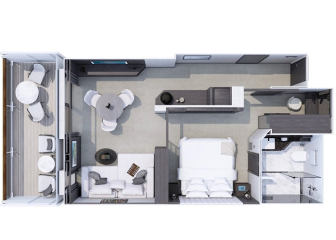 Ocean Residence - Cove Residence Suita 56 m² + Terasa s vírivkou, sedením a pohovkou alebo lehátkami 14 m² / 6. paluba: 24 m². Spálňa s obývacou a jedálenskou časťou, šatník. Koktailová súprava, minibar, kávovar, vodná kanvica, ďalekohľad, sejf, kúpeľňa so sprchou. Závesy, svetlo, klimatizácia ovládané smart technológiou. Taška Technogym Case Kit. Fľaša šampanského na privítanie. Maximálna kapacita 3 osoby. 23 710 € 11 855 € za osobu