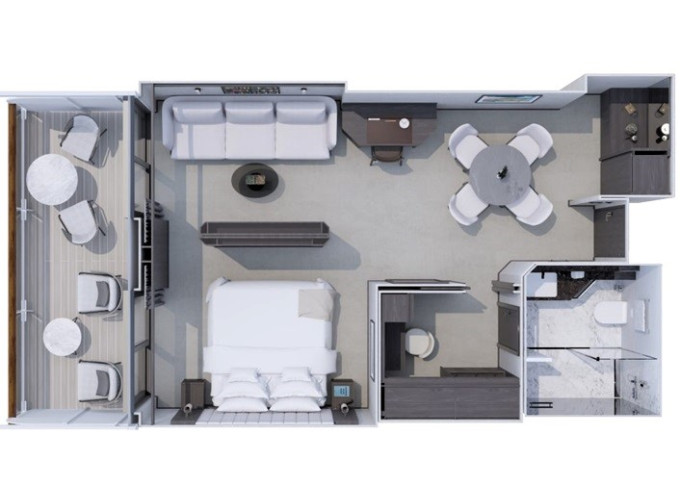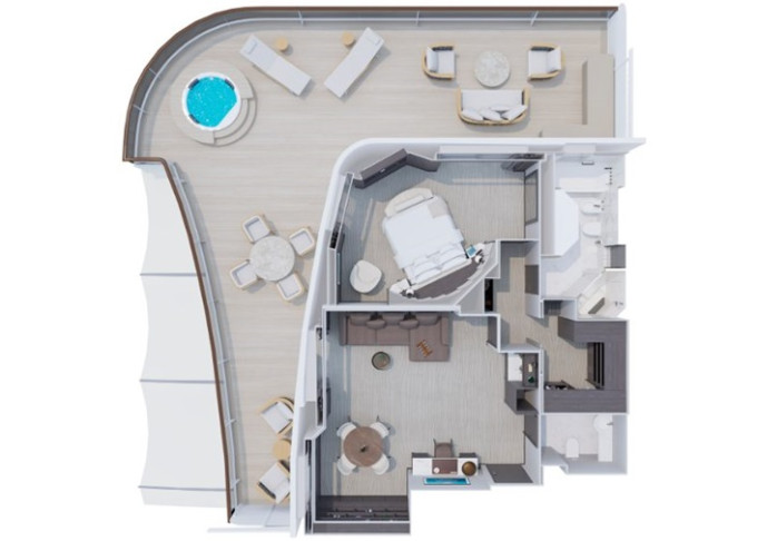 Ocean Residence - Cove Residence Suita 56 m² + Terasa s vírivkou, sedením a pohovkou alebo lehátkami 14 m² / 6. paluba: 24 m². Spálňa s obývacou a jedálenskou časťou, šatník. Koktailová súprava, minibar, kávovar, vodná kanvica, ďalekohľad, sejf, kúpeľňa so sprchou. Závesy, svetlo, klimatizácia ovládané smart technológiou. Taška Technogym Case Kit. Fľaša šampanského na privítanie. Maximálna kapacita 3 osoby. 23 710 € 23 710 € za osobu