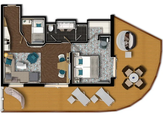 | VEPO - Kajuta s terasou Premium 17 m² + balkón 30 m² s 2 kreslami, 2 ležadlami a hojdacou sieťou. 7-11. paluba. Max 3 osoby. | 6 268 € 6 268 € za osobu | ||