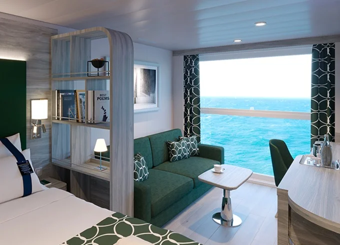Vonkajšie kajuty Infinite s panoramatickým zasúvacím oknom, ktoré sa po otvorení zmení na sklenenú balustrádu.