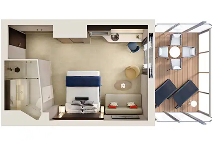 | B1 - Kajuta s veľkým balkónom Aft-facing 21 m² / balkón 8 m². 7. až 10. paluba - vzadu. Max 3 osoby. | 6 686 € 3 343 € za osobu |